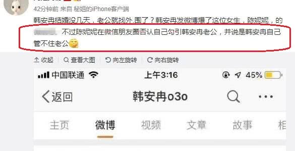 原标题:韩安冉刚结婚就传婚变?老公在外面出事,女方晒出聊天
